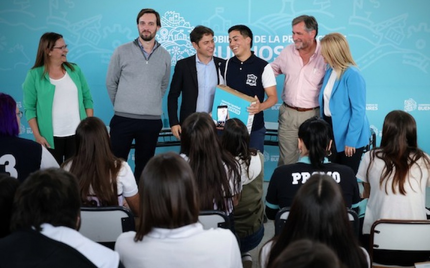 En el marco del programa Conectar Igualdad Bonaerense, el gobernador de la provincia de Buenos Aires, Axel Kicillof encabezó el acto de entrega de 87 computadoras a estudiantes de cuatro escuelas secundarias y técnicas del municipio de Suipacha, junto a la vicegobernadora Verónica Magario; el intendente local, Alejandro Federico; y el concejal Juan Luis Mancini.