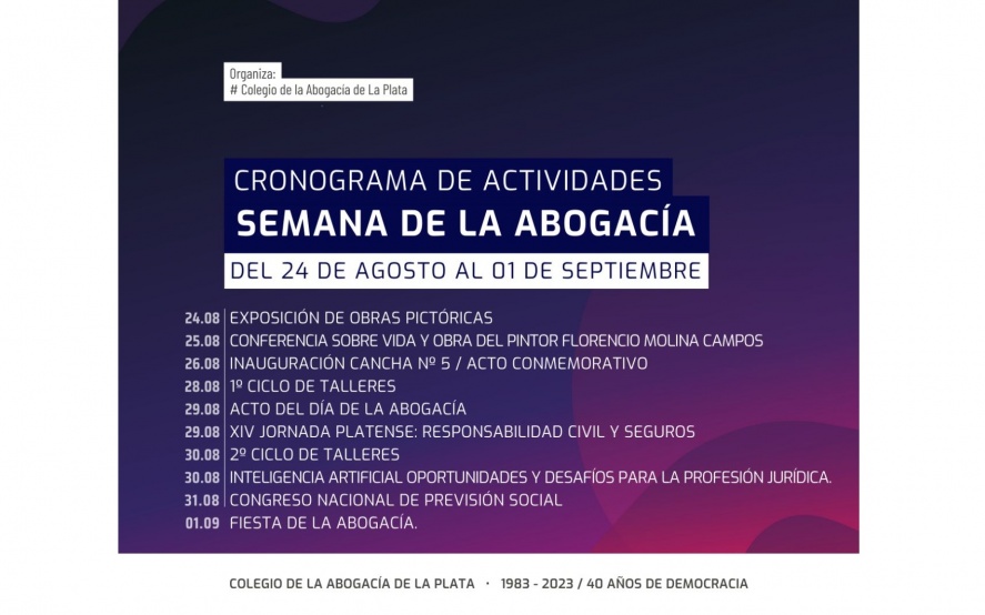 El Colegio de la Abogacía de La Plata desarrollará una serie de actividades en el marco de la semana de la abogacía que comenzará el próximo jueves 24 de agosto y se extenderá hasta el primero de septiembre.