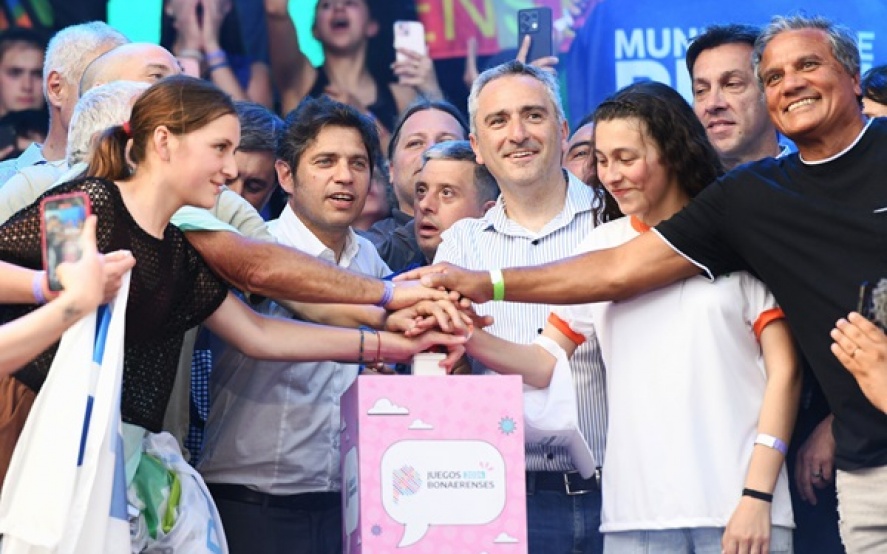 El gobernador Axel Kicillof participó este lunes en la ciudad de Mar del Plata del acto de apertura de las finales de la 33ª edición de los Juegos Bonaerenses, en las que competirán más de 26 mil jóvenes y adultos en actividades deportivas y culturales. Fue junto al ministro de Desarrollo de la Comunidad, Andrés Larroque; y el subsecretario de Deportes, Leandro Lurati.
