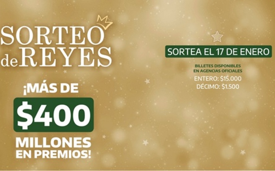 Con más de $400 millones de pesos en premios, el viernes 17 de enero se realizará el Sorteo de Reyes. Tenes tiempo de comprar tu billete hasta el mismo día del sorteo a las 20:45 hs en cualquier agencia de la provincia de Buenos Aires.