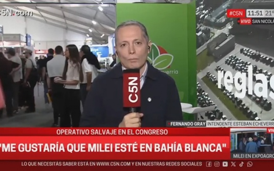 Fue durante el móvil del canal de noticias desde ExpoAgro, donde el intendente Gray daba a conocer el plan para que empresas se radiquen en el partido de Esteban Echeverría y obtengan 10 años de exención de impuestos.