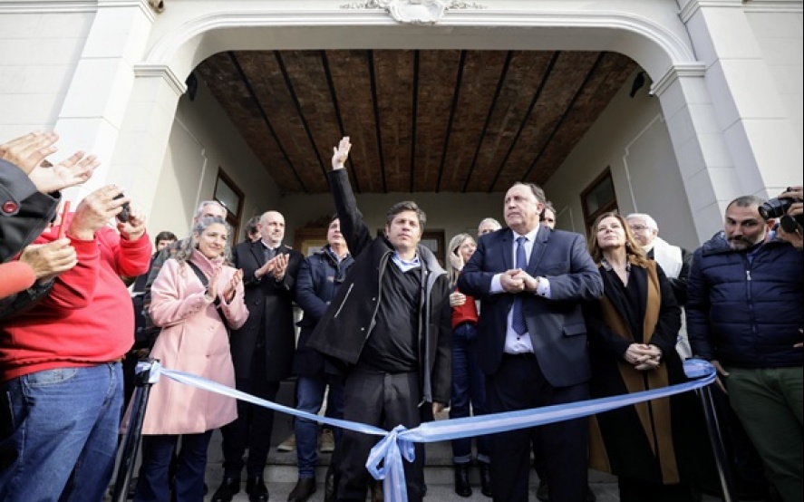 El gobernador de la provincia de Buenos Aires, Axel Kicillof, encabezó este miércoles en General Las Heras el acto de reinauguración del Cine-Teatro de la Sociedad Española, tras una obra de refacción integral llevada a cabo en su histórico edificio que había permanecido cerrado durante 40 años. Fue junto al ministro de Infraestructura y Servicios Públicos, Gabriel Katopodis; la presidenta del Instituto Cultural, Florencia Saintout, y el intendente local, Javier Osuna.